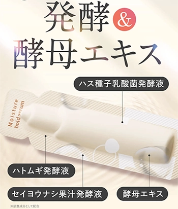 ピリモクリアモイスチャーセットの美容液モイスチャーホールドセラムには、肌なじみをサポートする発酵・酵母エキスも各種配合。